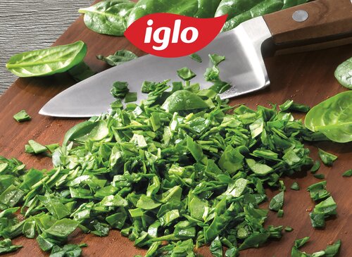 iglo gehackten Spinat in Pellets auftauen lassen. Zwiebeln fein schneiden und in heißem Olivenöl glasig anschwitzen. Mit Fond/Suppe und Schlagobers aufgießen.